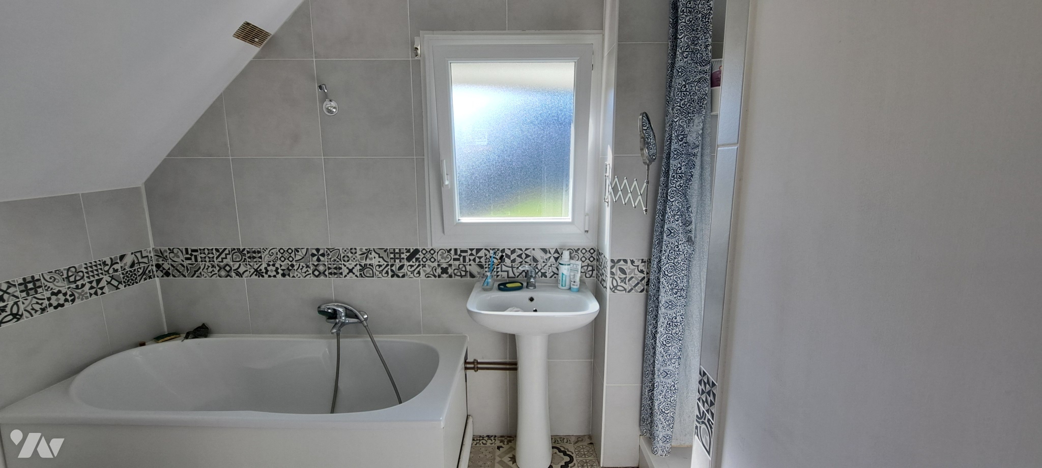 À l’étage, un grand palier dessert deux chambres, un bureau et une salle de bains avec WC.