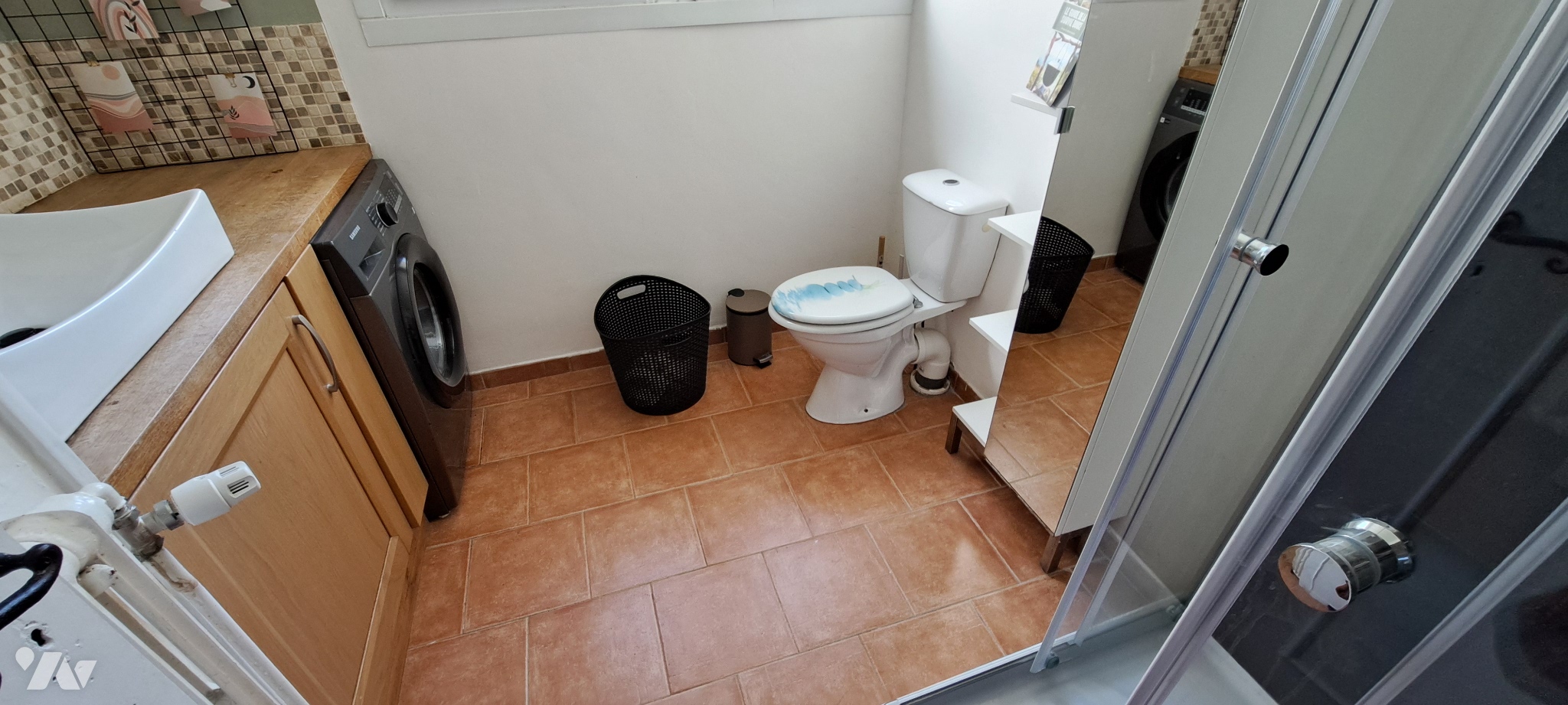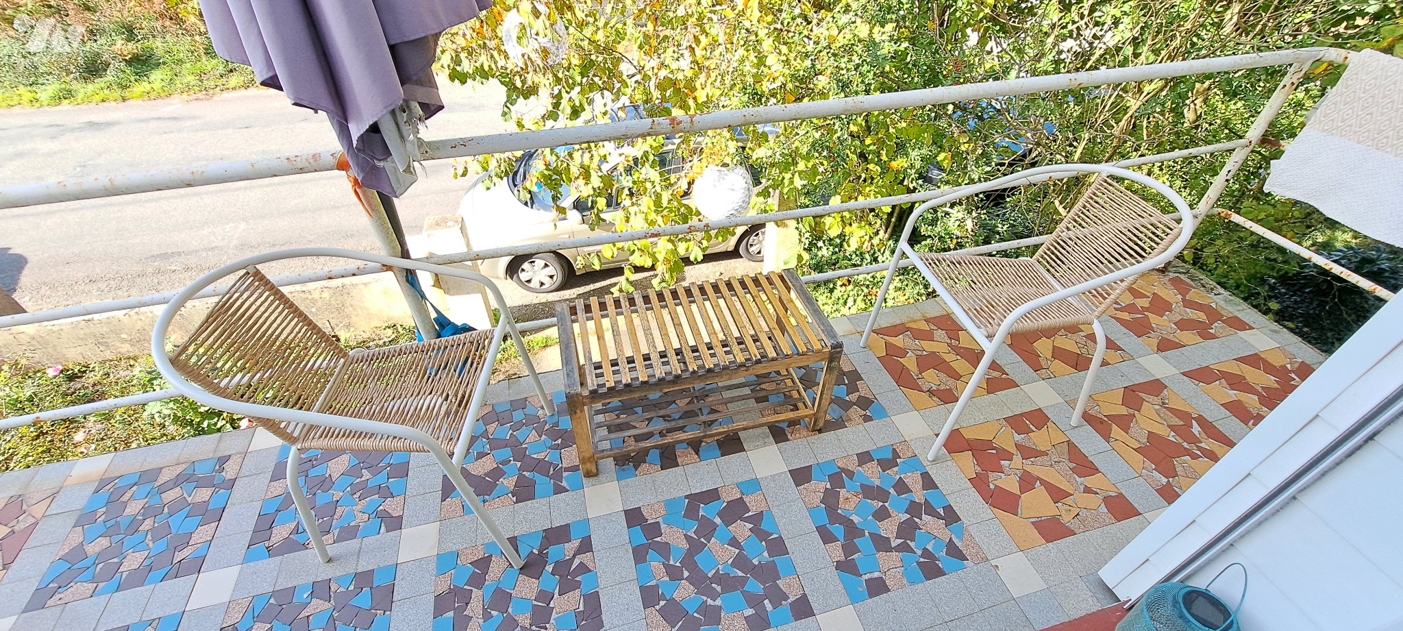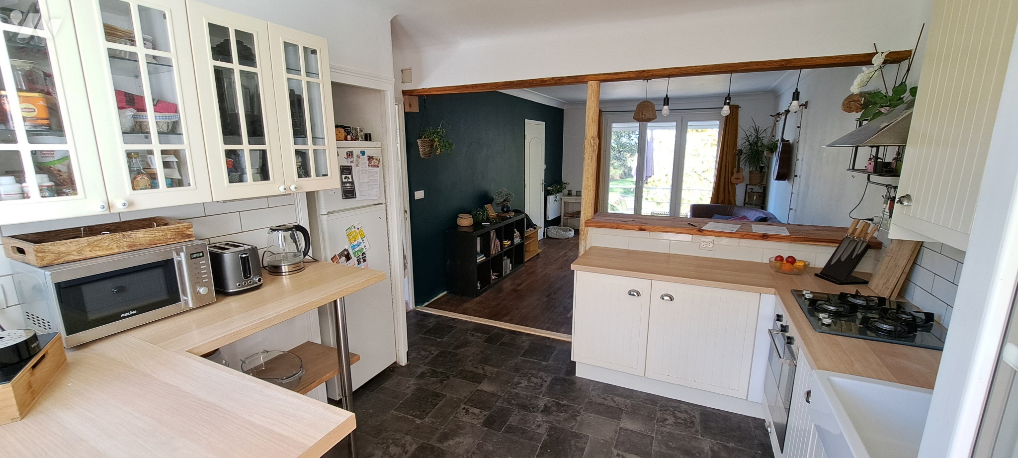 L’entrée principale ouvre sur une cuisine ouverte sur le séjour, lumineux et tourné vers le jardin. Le séjour s’ouvre également sur un balcon à l’avant, pouvant accueillir une petite table et deux chaises.
